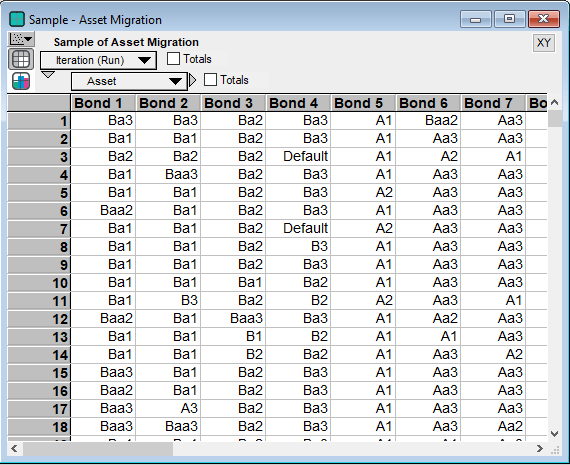 Combining the Asset Threshold variable and the Asset Return variable gives us the migrations for each simulation run of the portfolio. Below are several of the bonds and their migrations on different simulation runs. For instance during simulation run 6, Bond 1 has an Asset Return value of 2.02 (see above). Then from the Asset Threshold table we see that 2.02 is greater the Baa2 threshold of 1.622 but less than the Baa1 threshold of 2.046. Hence Bond 1 moves from the initial rating of Ba1 to Baa2 on run 6.