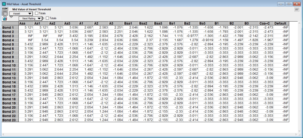 As can be seen from the migration influence diagram above, the migration matrix is used to create the Threshold Matrix variable, which contains the threshold standardized asset return values that determine the credit rating of each asset at the risk horizon. This variable uses the inverse normal distribution to map the transition probabilities to the threshold values. The Asset Threshold (below) is simply the threshold values for each asset given their initial ratings.