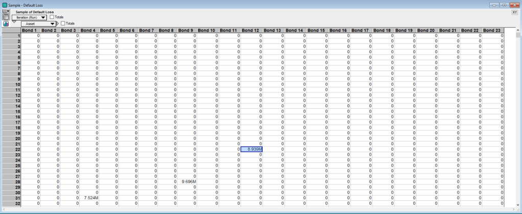 The Asset Recovery Rate then maps the simulated industry and seniority level recovery rates to the specific assets in the portfolio. The Asset Default node is an indicator variable of when an asset migrates to the default state. This node is calculated during the migration analysis. Combining this information, along with the initial dirty prices of each bond and their exposures, gives us the last node on the right, Default Loss. Default Loss is the simulated losses on default. Below is the sampling view of Default Loss and, as expected, default is relatively rare with the first event occurring in the 22nd simulation run of the model for Bond 12.