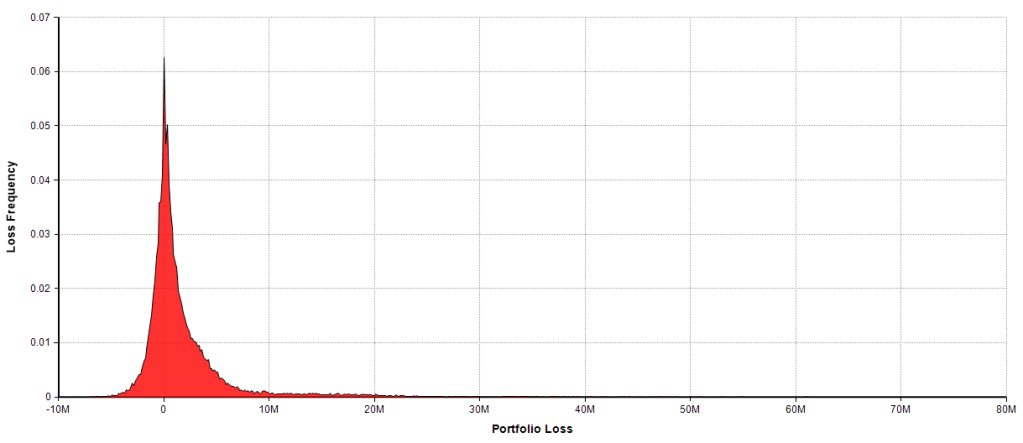 As mentioned above traditional statistics like the mean and standard deviation do not provide a complete picture for a credit loss distribution. However with Monte Carlo simulation we can capture the entire distribution and thus use tail risk measures to better quantify the portfolio’s risk. I posted above the loss distribution for this portfolio of assets, but here it is again so that you don’t have to scroll up: