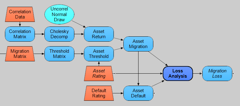 In this model, migration analysis is built around two key inputs, the correlation data and the migration matrix. See the influence diagram below. The orange trapezoid nodes represent assumptions and are entered into the model by the user on the inputs and assumptions panels.