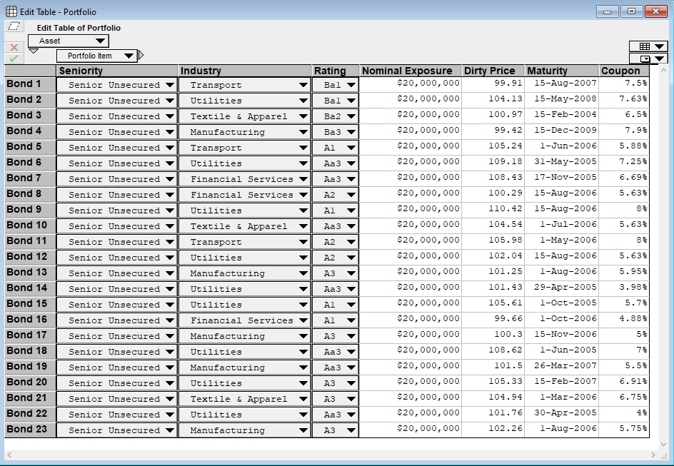 Once the other assumptions are entered, then the portfolio details can be completed in the Portfolio table. As mentioned above the data comes from Ramaswamy (2004). The sample portfolio is 23 corporate bonds each from a different obligor. (The reason that these are different obligors is that this model does not consider the case of cross default clauses, which declare all debt issues of an obligor in default if one issue defaults.)