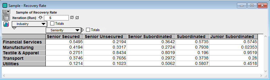 The Recovery Rate node is the simulated recovery rates for each seniority level and industry on each run of the simulation. Below are the simulated recovery rates for run 5 of the simulation: