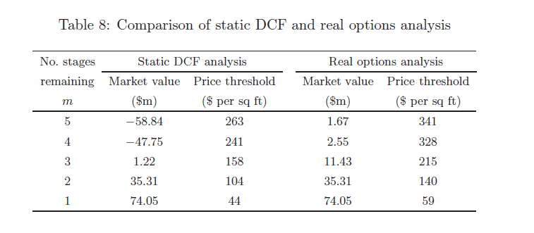 The value of the project is then the value in Phase 1 at Month 0: $1.676M. From Guthrie’s paper the table below compares the value of the real options approach to the traditional NPV approach for each phase assuming the project is in Month 0. (The “No. Stages Remaining” is the reverse of the Phase number in the model, so Phase 1 has 5 Stages Remaining):