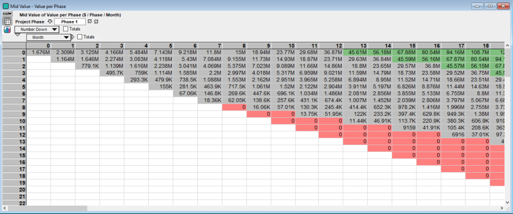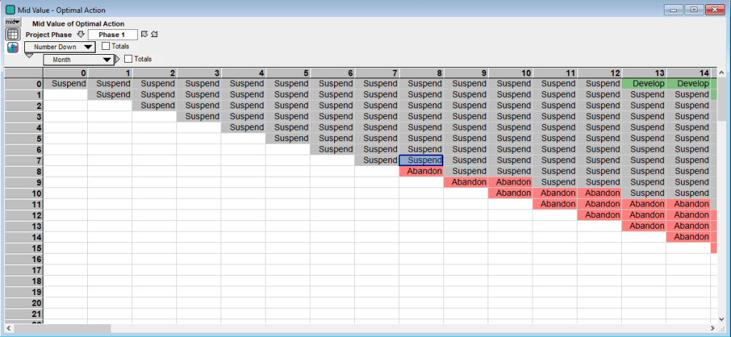 The value in each cell/state is based on the manager’s decision of whether to develop and invest in constructing that phase (green cells), delay (gray cells) or abandon the project (red cells). The action that provides the highest value is chosen. For the final construction phase, Phase 5 above, develop is often the optimal action in the early months of the project. However these states are typically unreachable because of the construction time need to complete the earlier phases. Looking at the same months for the initial phase, Phase 1, provides a different picture of the project: