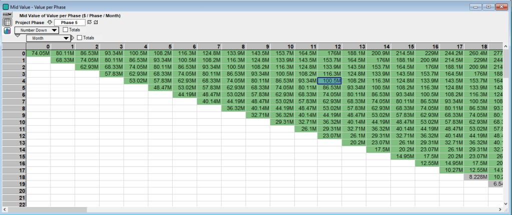 Once the inputs have been entered the project can be valued. As mentioned above the detailed solution procedure is described in Guthrie’s paper. But the basic idea is to work backwards from the market value of a completed project in each state to the project value today. (A single cell per phase in the table above is a state.) Thus the project value for each state in phase 5 is derived from the market prices of a completed building and the value of the project in phase 4 is derived from the project value of phase 5. This process iterates back to the starting point at Month 0 in phase 1. See the project value in phase 5 below: