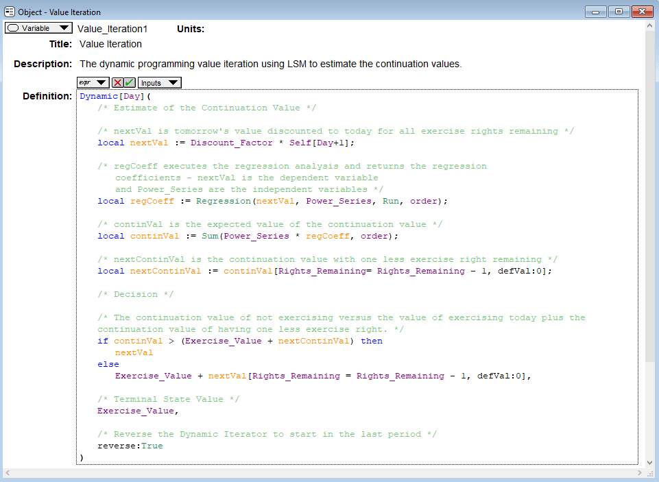 The above code computes the swing option values for each number of option rights remaining, in each time period, and along each simulation run using ordinary least squares to approximate the continuation values of the option. Now let’s look at the Analytica code that does the same thing (if the code below is hard to read click here for an enlarged image):