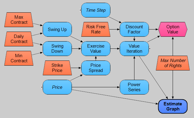 Another advantage of Analytica over Matlab that I did not touch on in the previous post that also reinforces the principle of code reliability through code transparency is the diagrammatic model building. In Analytica models are represented as a series of nodes and arrows connecting the nodes. This is called an influence diagram. The shapes have meaning as well, where the orange trapezoids here represent inputs and assumptions, the blue rounded rectangles are intermediate calculation nodes and the reddish hexagon is the objective that we want to calculate. Arrows connect dependencies and inputs for calculations, e.g. Exercise Value is a function of the Swing Up, Swing Down, and Price Spread values. Below is the main part of the swing option model that includes the backward induction iteration discussed above (which is the Value Iteration node):