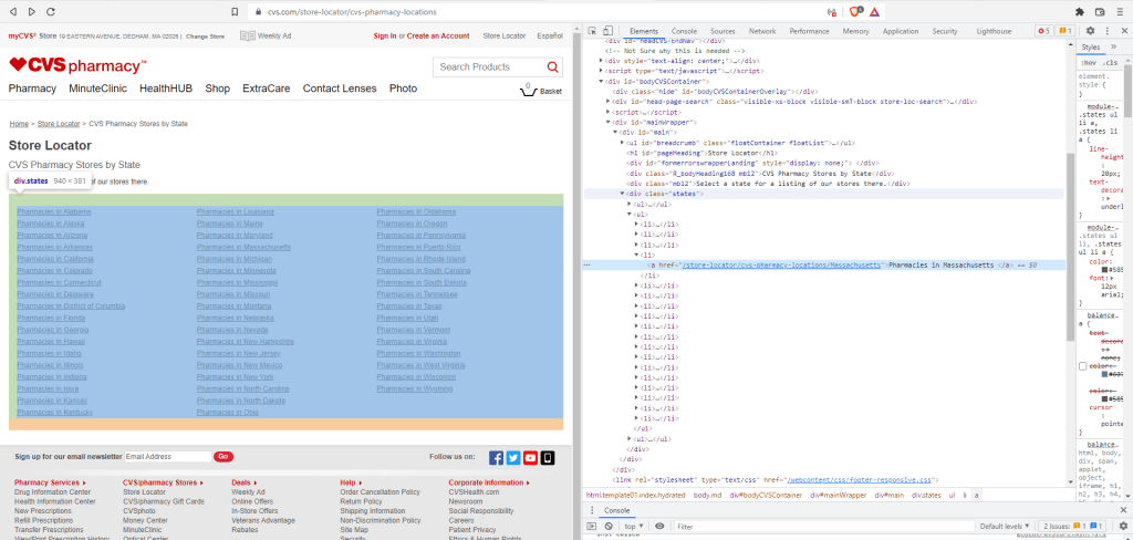 On the left is the page as we see it when we navigate to it (minus the blue and green colors which are just highlighting the selected sections from the right pane). On the right is the developer’s view, which contains the HTML and CSS code that generates the view on the left. It is this code on the right that our scraper needs to find the links to each of the CVS state specific webpages. For example in the right pane above, the link to the webpage for the Massachusetts pharmacies is in the second horizontal blue line. It has an HTML element a (“a” is for anchor) with an href attribute linking to the webpage of Massachusetts stores. As we will see below these HTML elements are what we need for the scraper.