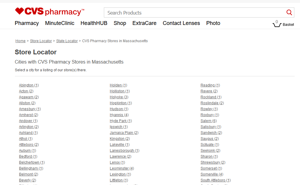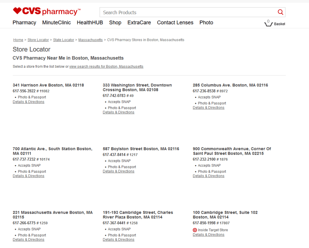 And finally once when we click a town then we see all the CVS locations in the town. For example here are the first 9 of 27 locations in Boston: