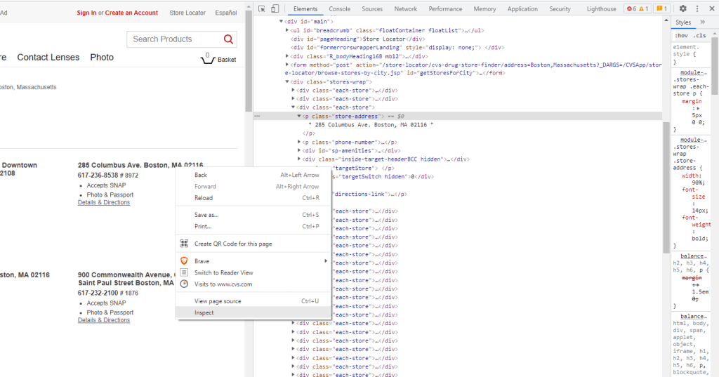 Thus we see that the address for 285 Columbus Ave is in an HTML element called p (paragraph elements) with a class attribute equal to “store-address”. These HTML elements are the same for address in each town. Lastly with this HTML element we can then obtain the address.
