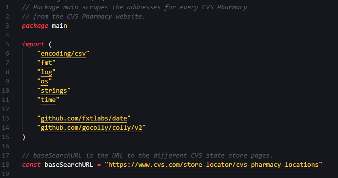 The last line of the code snippet has the constant baseSearchURL defined as the website URL that we saw above. It has the web-links to each CVS state store page and is where the scraper starts its journey.