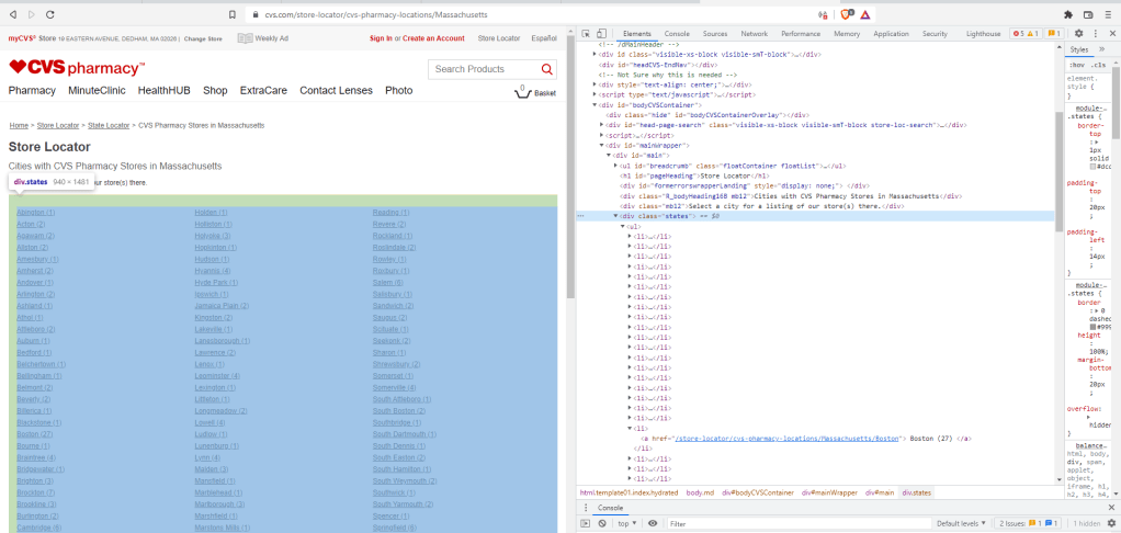 On the left, once again, is the list of Massachusetts towns and the number of pharmacies per town, while on the right is the HTML document of that same list of towns. As above we locate the HTML elements that we need to navigate to a town’s CVS address webpage. In this case the elements are a div (division elements) with a class attribute called “states” followed by list elements, li, which contain a (anchor) elements with href attributes that hold the desired web-links. For example the link to Boston is open on the right hand pane.