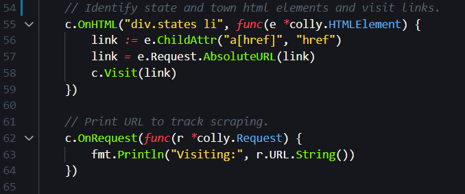 The next method that is called on line 62 is OnRequest which takes a function and executes that function when the collector makes an HTTP request to a website. Here OnRequest will print the visited website to the console. This allows us to track the collector as it traverses the different state and town websites in real time.