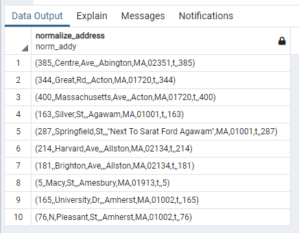returns a composite data type for each record called a norm_addy with each address’s elements decomposed into appropriate fields. See below: