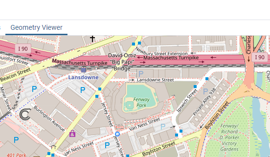 The blue circle at the intersection of Jersey Street and Van Ness Street in the image below is the point representing Fenway Park: