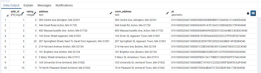 The column addr_id is a unique identifier for each address. The column rating is the rating that the geocoder returns. It is an integer estimate of how accurate the geocoder is in finding the appropriate coordinates. A rating of zero is a perfect match while higher ratings indicate that the geocoder is having difficulty finding appropriate coordinates for the address. The address column is just the raw text address from the web scraper. The column norm_address will hold a “pretty print” version of the address that the geocoder returns. It can be used to compare the address the geocoder “sees” with the inputted address. And lastly pt holds the coordinates returned by the geocoder as a geometry spatial data type. Spatial data types will be discussed more below.