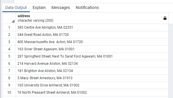 Note again that cvspharm is the schema for the CVS pharmacies. The above code returns 413 store addresses in Massachusetts and places them into the table cvspharm.ma_stores. Below are the first 10 addresses: